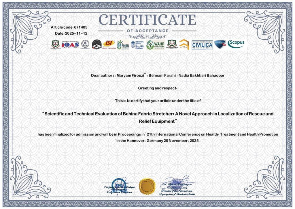 The safe transfer of patients from accident scenes to medical facilities is a critical responsibility of emergency medical teams. The choice of transport equipment significantly affectsScientific and Technical Evaluation of Behina Fabric Stretcher: A Novel Approach in Localization of Rescue and Relief Equipment patient safety, as inappropriate devices can increase the risk of secondary injuries. Fabric stretchers have become essential in rescue operations due to their lightweight, portable,